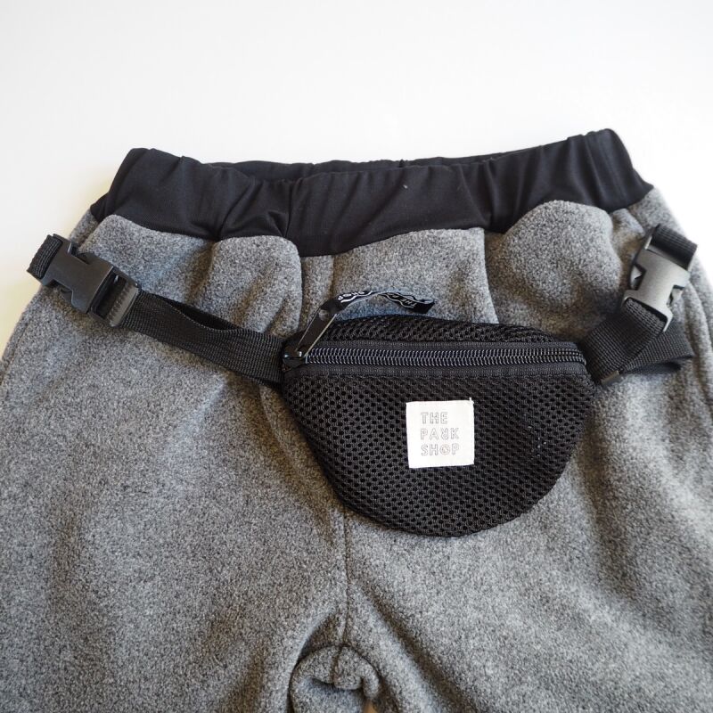 メッシュサコッシュ付きのフリースパンツ。